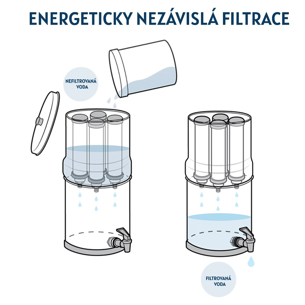 Gravitační vodní filtr SM4 s keramickými vložkami je složen ze dvou nádob z nerezové oceli, kdy jedna nádoba leží na druhé. Čtyři keramické vložky jsou umístěny v horní nádobě, která je naplněna neupravenou vodou. Voda pomalu prochází keramickými vložkami pomocí gravitace, kde jsou zadrženy a usmrceny bakterie, cysty, a další paraziti. Filtrací se rovněž zbavíte veškerých mechanických nečistot, bahna, rzi, atd. Díky vložce z aktivního uhlí, která se nachází v nitru keramické vložky je voda také zbavena chloru, zápachu a nepříjemné chuti.